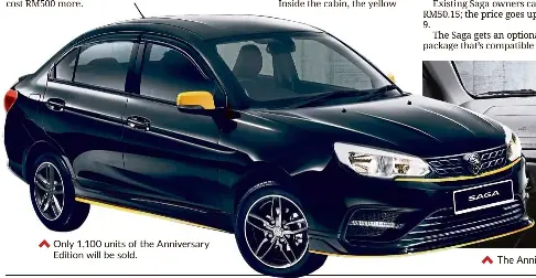 Surprisingly the car is priced at rm39 300 on the road without insurance which is also the same price as the current premium at. Limited to 1 100 units only and available exclusively in black with yellow highlights on both the exterior and interior of the car the saga anniversary edition is priced rm39 300 the same as the current saga premium at after the zero sales tax rebate.